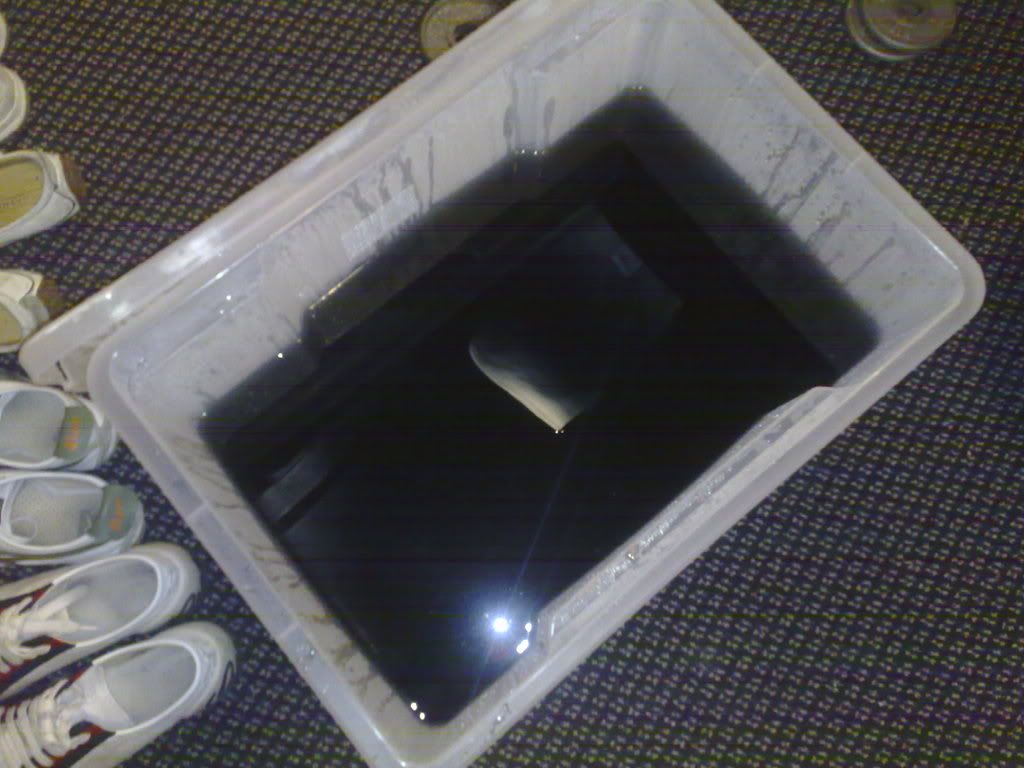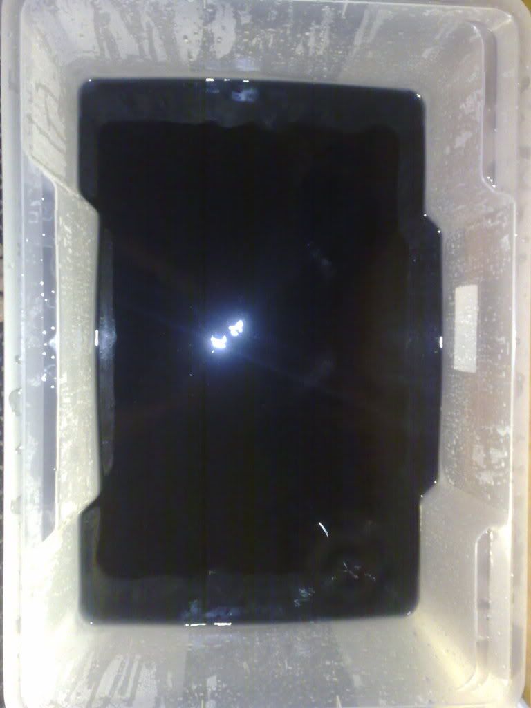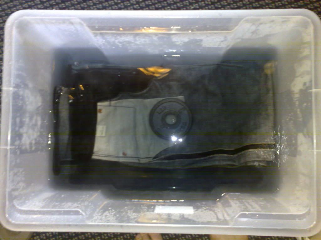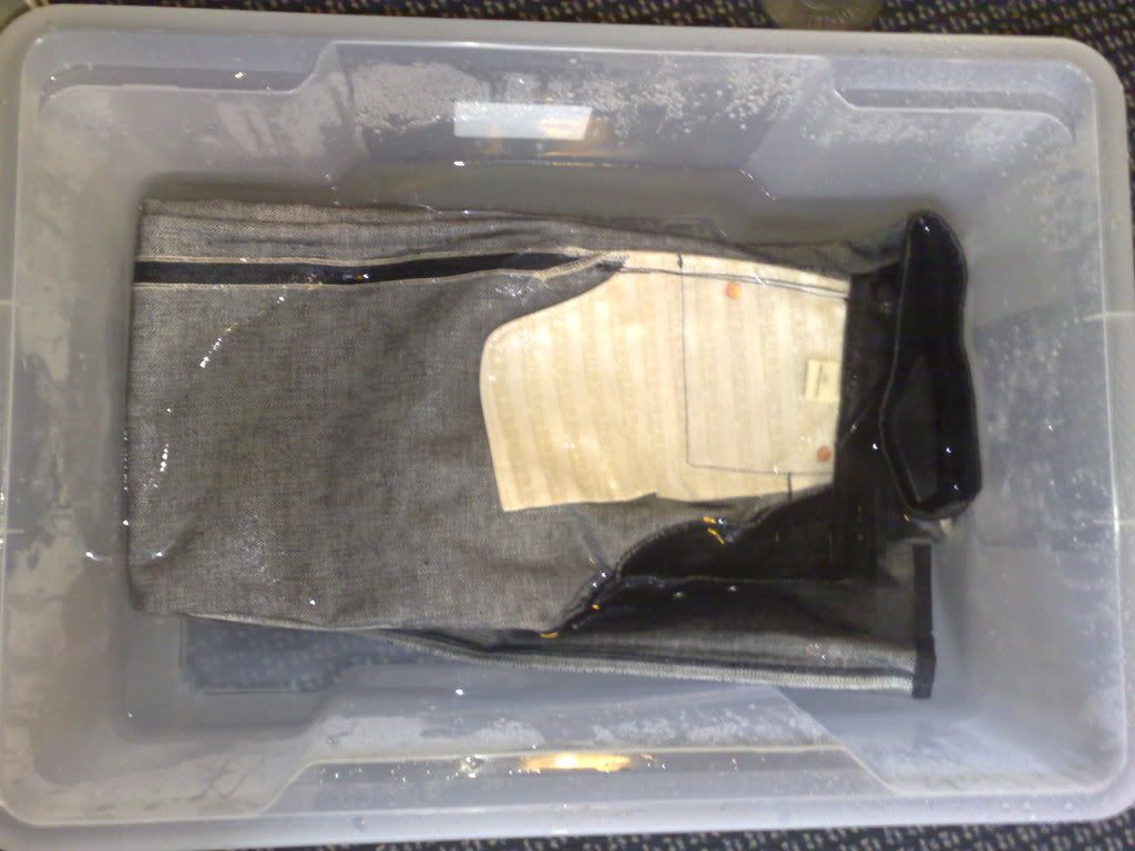 as u can see, the water turned into darkish-blue instantly. a small piece of weight was used to hold the jeans down. then, i covered it for 3 hours. i did add hot water every hour to maintain the temperature.